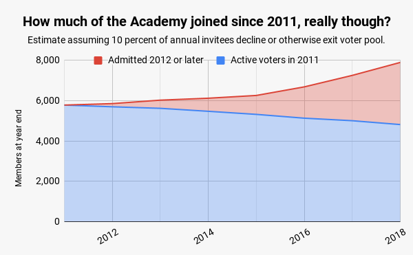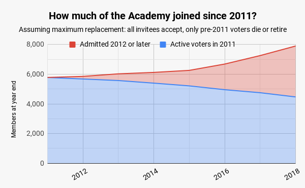This means, though, that the new members account for much more of the Academy than the raw invitees would indicate. Let’s look at the most severe case: let’s assume that every single person who’s invited joins, and that everyone who exits the voter pool through retirement or through death or what have you was in the Academy in 2011. What would 2018’s voter pool look like in that case?