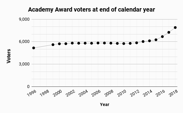 The organization is comprised of several branches — directors, actors, sound, designers, and so on — who decide who to admit and who not to. AMPAS is super coy about how many active members it has, but I tracked down historical copies of the Academy press releases and linked them to some truly outstanding data annually compiled by Steve Pond at The Wrap and, for the 2018 data, GoldDerby, to build this dataset of the number of Academy voters at the end of every year: