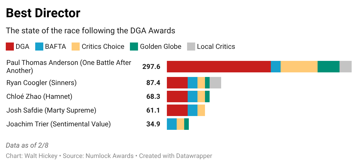 Somewhat quick update this week in light of the Directors Guild of America Awards on Saturday. Nothing too surprising if you followed that event with the winner being One Battle After Another in general and Paul Thomas Anderson in particular.