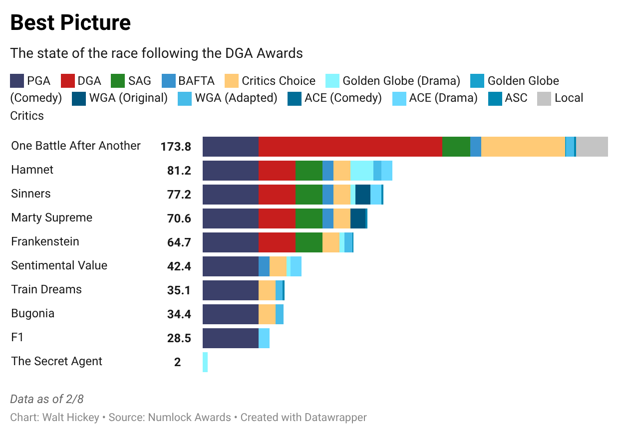 The race isn’t over, but we’re pretty clearly in the middlegame, and it won’t take much to push us to endgame. BAFTA on February 22 will be decisive; a win for One Battle After Another there wouldn’t entirely secure OBAA as the frontrunner on Oscar night, but it would take enough points off the board such that even a massive late surge from a rival like Hamnet or Sinners would not be enough to be a frontrunner. A win for a rival at BAFTA, on the other hand, may tip the race by at least signaling which of OBAA’s competitors is likely to consolidate support in the ranked-choice voting on Oscar night.